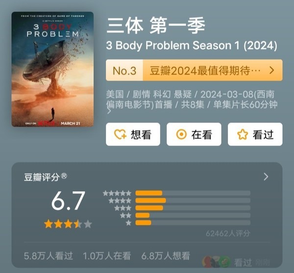 据了解,网飞版《三体》3月21日开播后,在烂番茄网上获得76%的新鲜度和69%的观众爆米花指数,豆瓣评分高达6.7,其中5星23.3%、4星26.5%、3星24.2%、2星12.4%、1星13.6%。这表现吊打异化开天的动画版《三体》,但被腾讯版《三体》和《我的三体》系列吊打。