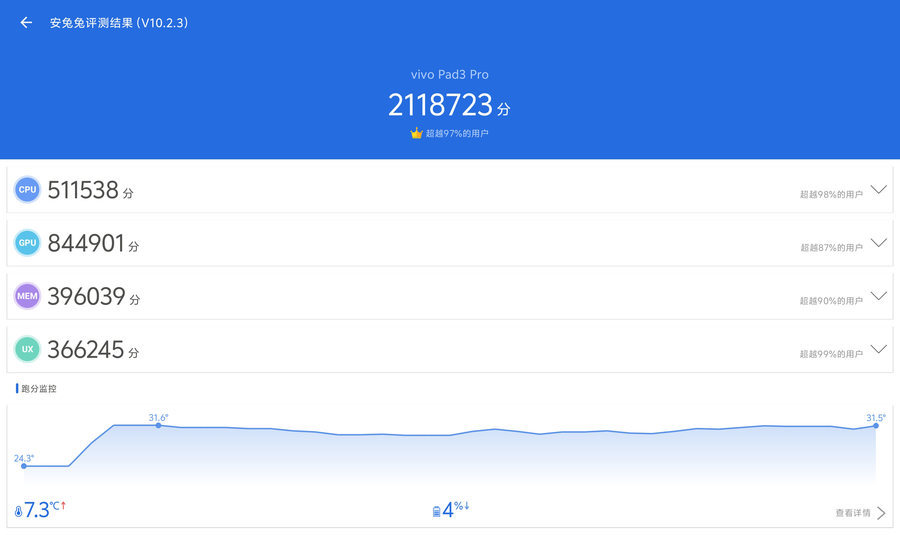 经过实测,vivo Pad3 Pro(16+512GB存储版本)的安兔兔跑分已经超过了211万,表现十分优秀,性能处于安卓平板当中的领先水平。