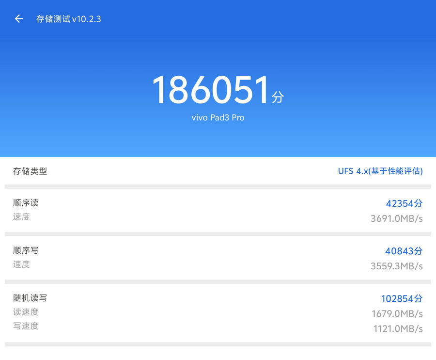 存储读取测试中,vivo Pad3 Pro(16+512GB存储版本)的顺序读取速度达到 3691 MB / s,顺序写入速度达到3559 MB / s,表现也相当不错。