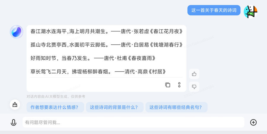 例如可以让蓝心小V,帮自己推荐一些关于春天的诗词。