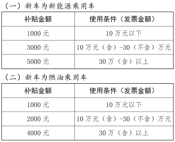 这里的新能源乘用车包含纯电动汽车、插电式混合动力汽车(含增程式)、燃料电池汽车三类(机动车行驶证副页有“新能源”标注,挂绿色车牌)。以上购车发票金额以机动车销售统一发票中的价税合计数为准(车辆装潢、挂牌等其它费用不得列入其中)。本次活动,政府补贴共计5000万元整,按消费者在系统中提交完整合规、真实有效申领信息的先后顺序,先到先得,兑完即止,活动期内每人仅可享受一次补贴。