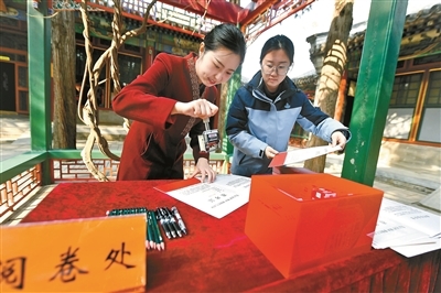 昨日,为纪念中共中央进京“赶考”75周年,颐和园益寿堂升级打造的“红色阅读空间”正式亮相。据悉,颐和园升级打造红色体验活动,推出配套红色文化宣传产品、折页、红色印章等,同时特别推出颐和园益寿堂知识答题准考证和光荣证。图为工作人员在给颐和园益寿堂知识答题准考证上盖编号章。