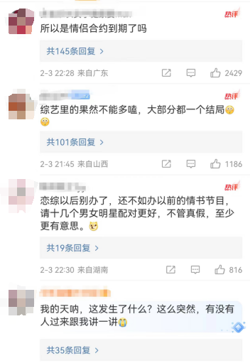 因而,“芋圆CP”分开后,有网友心都碎了,说看恋综再也不敢真情实感了,担心自己会再次受伤。还有人发出灵魂拷问:“所以是情侣合约到期了吗?”