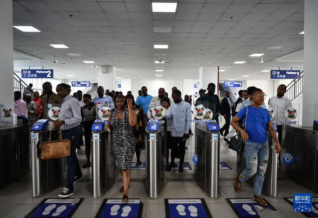 2月28日,在尼日利亚拉各斯,人们在轻轨蓝线码头站刷卡出站。
