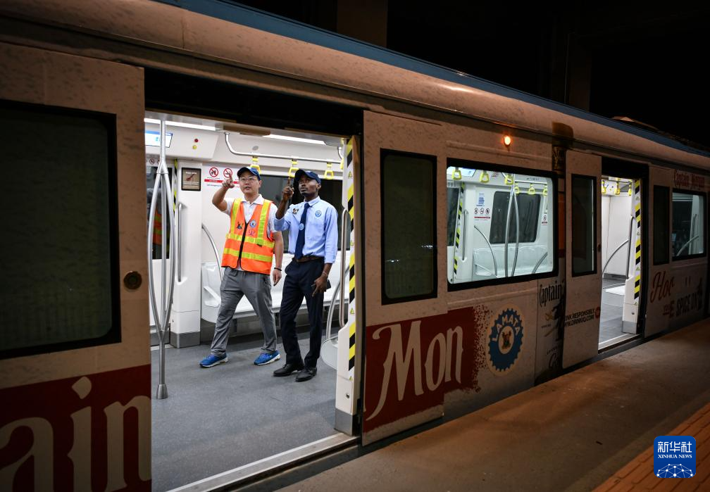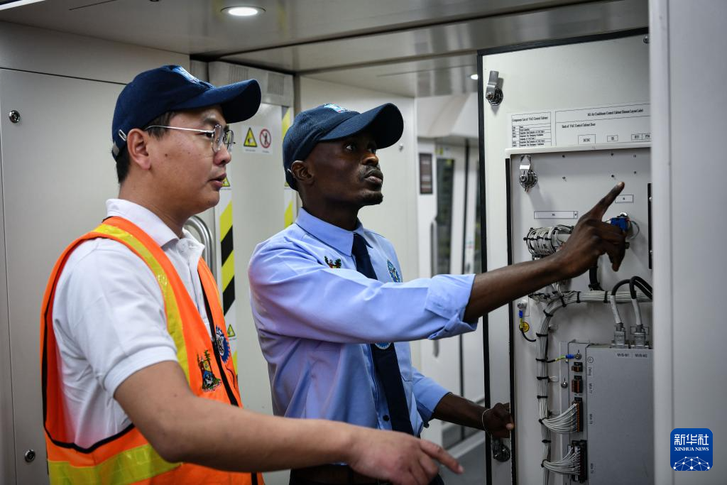3月3日,在尼日利亚拉各斯,见习司机阿旺甘斯(右)和中国师傅王奥飞在发车前共同检查轻轨蓝线列车车厢空调设施。