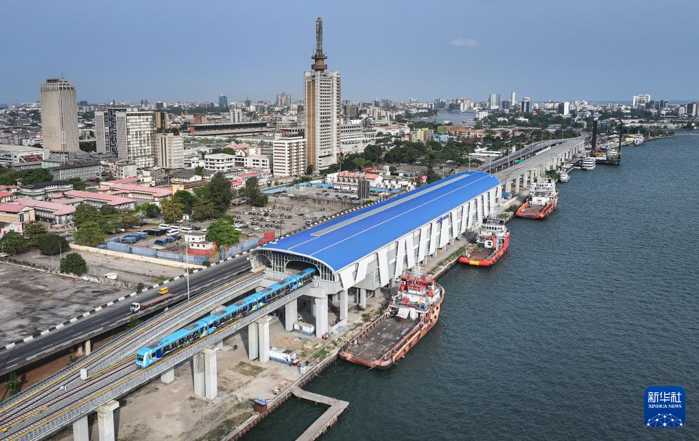 3月4日,在尼日利亚拉各斯,一列轻轨蓝线列车驶入码头站(无人机照片)。