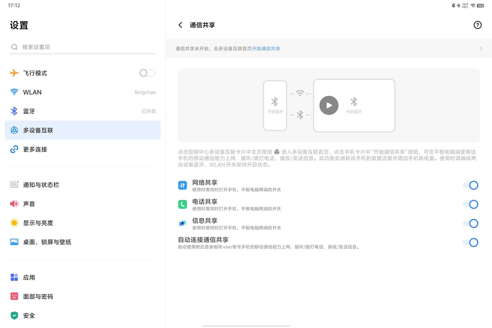 这次 vivo Pad3 Pro 终于加入通信共享功能了,只要登录相同的账号,手机和平板靠近就会自动连接,手机一有电话或者短信,在平板上就可以同步通知。网络数据也可以同步到平板上,相比于开热点的连接方式,通信共享可以带来更稳定的网络,还能有更好的传输速率,但可惜的是目前仅支持 iQOO Neo9 Pro 这一款机器,希望后续可以尽快适配更多机型。