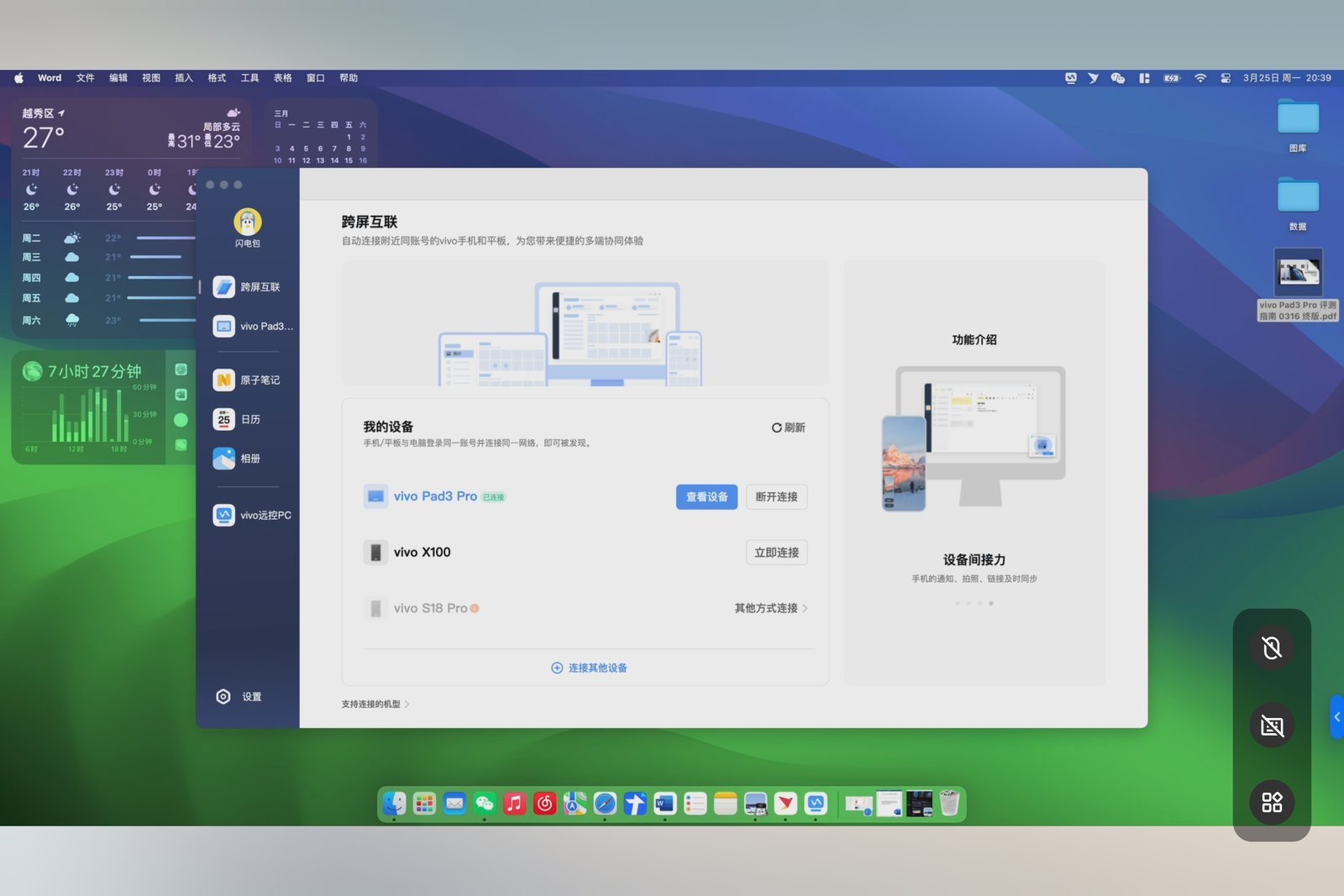 还有就是 vivo 远控 PC 功能了,以往这个功能只支持远控 PC 设备,但在 vivo Pad3 Pro 上新增了远控 Mac 的功能,并且只要建立连接就可以在平板上远程完成 Mac 上的文档编辑或者打开 APP,甚至是关机、重启这些操作都可以完成,不得不说 vivo 还是非常愿意倾听用户的建议的,这个功能的加入也极大地方便了 Mac 用户。