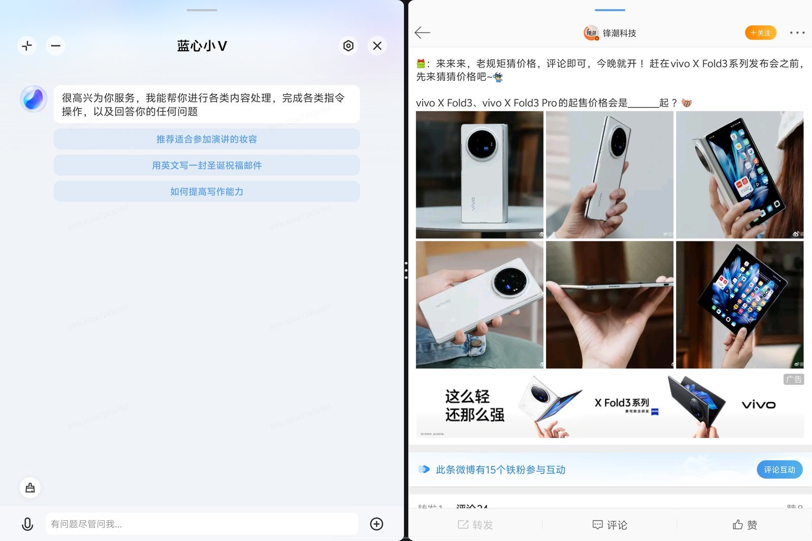 「蓝心小 V」的呼出方式也非常简单,除了最基础的悬浮图标,还能在桌面以及悬浮图标中看到它的身影,但我日常用的最多的还是在侧边栏呼出,也是比较方便的一个方法。蓝心小 V 的出现形态也有多种样式,除了全屏状态,需要实时使用的情况下可以采用分屏的方式,临时使用还可以直接变成小窗状态,用完就关,非常方便。