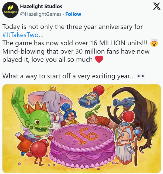 近日开发商 Hazelight Studios 宣布该游戏销量已超过 1600 万套,而去年 2 月的最新数据为 1000 万。因此,这款游戏保持着良好的发展态势。此外,自游戏发布以来,《双人成行》的玩家数量已成功超过 3000 万。