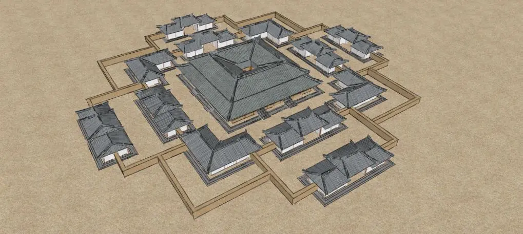 遗址结构清晰——以中心夯土台基为中心,东西南北各有两组并行对称的长方形附属建筑,四角分布曲尺形附属建筑。残留建筑遗迹面积近9000平方米。