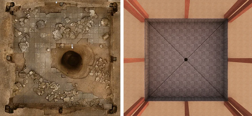 这是四角 坪遗址中央夯土台基中心的半地穴空间及甘肃考古工作者绘制的复原图。