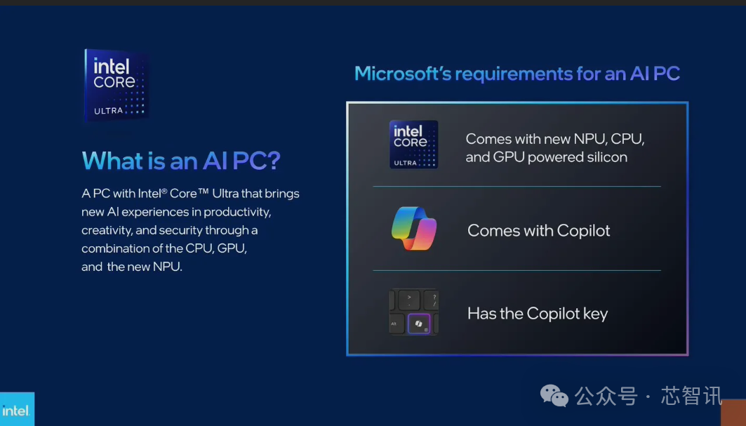 目前,英特尔、AMD、苹果、高通都有推出集成了专用AI运算单元的面向AI PC的芯片,但是各家厂商对于AI PC都有自己的理解,因此缺乏对于AI PC的标准定义。对此,英特尔和微软联合制定了对于AI PC的定义标准:需有NPU、CPU和GPU,并支持微软Copilot,键盘更直接有Copilot物理按键。这也意味着,如果缺少Copilot键的Meteor Lake和AMD Ryzen(7040/8040)笔记本电脑都不符合标准。