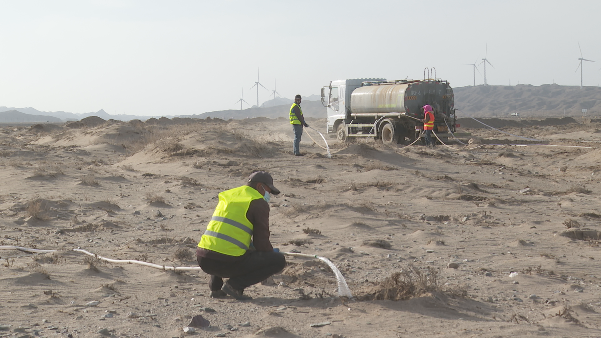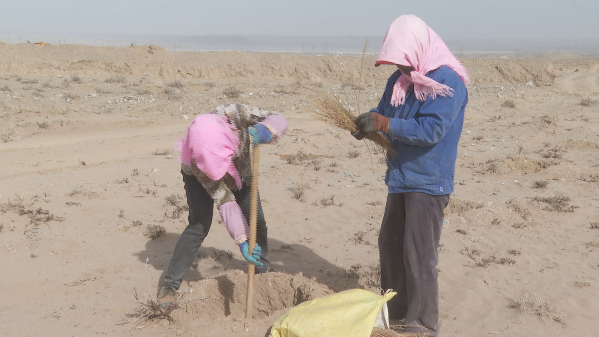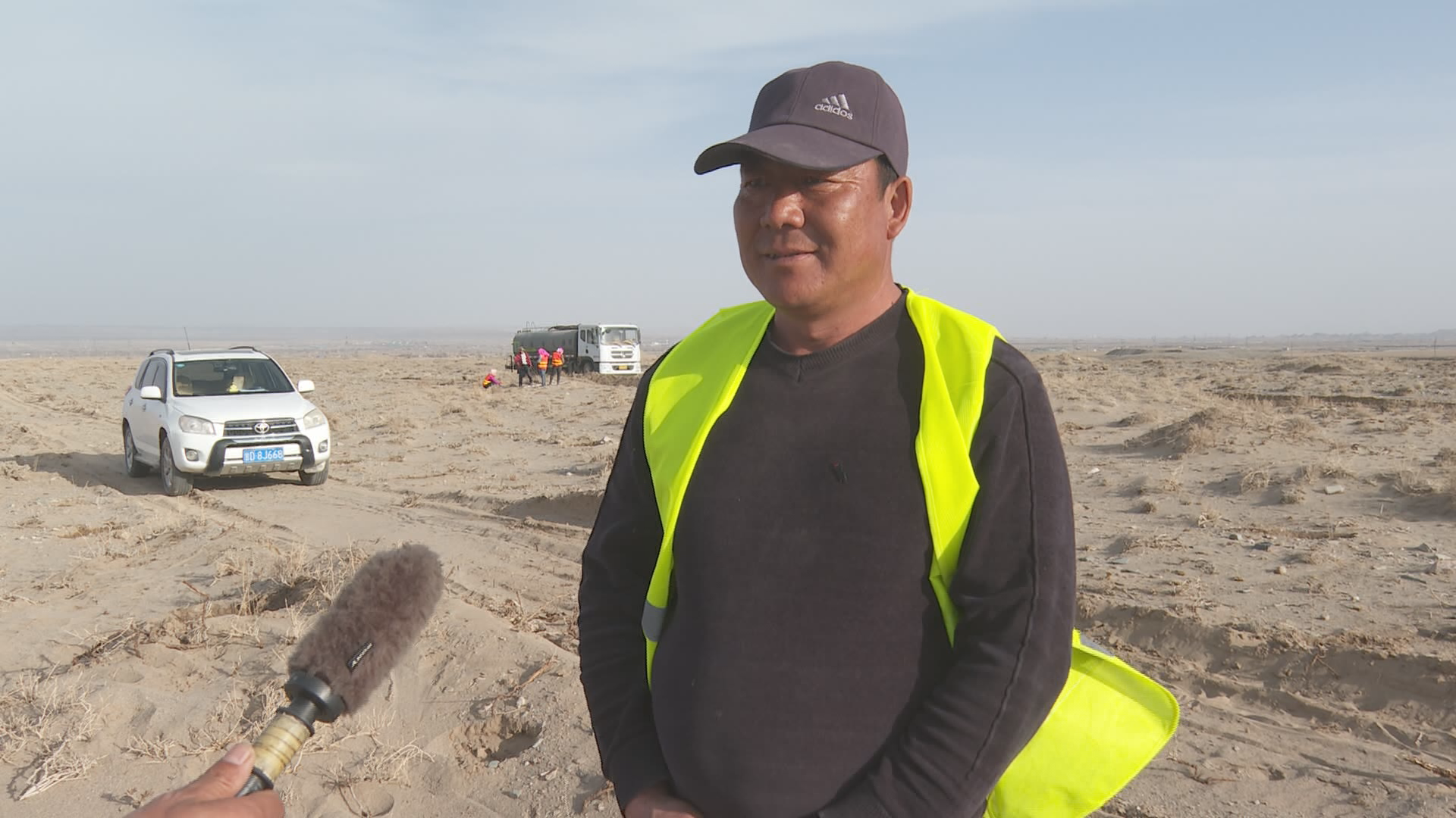上沙沃人造灌木林片区负责人 陈怀根:我今年过来到景泰县上沙沃镇承包了9000亩地,种了两种治沙植物,一种是梭梭,梭梭不带刺;一种是柠条,柠条带刺,这种植物根发达,(我们)边栽边浇水。我们十天半个月浇一次水,连续浇三个月,成活率就能上去。