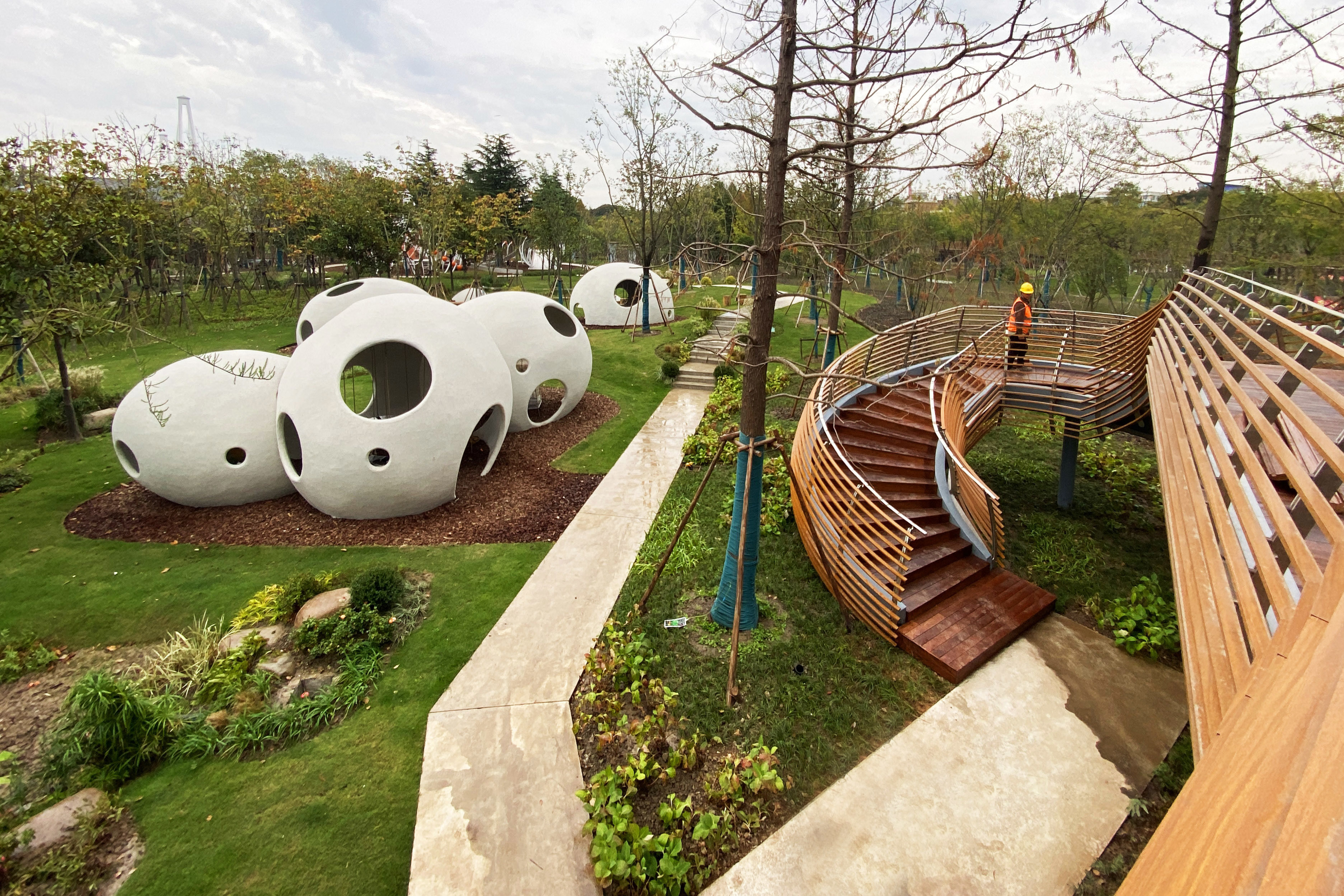 为了保护树木等原有自然元素,设计师们不断优化和调整设施的定位。譬如森虫秘境中,水系的设计不止是呈现在图纸上,还要根据现场的苗木分布和地形高差,进行设计调整,最终成就了蜿蜒于林间的水系和自然的跌水景观,不仅保存了既有自然生态,也增添了诗意。