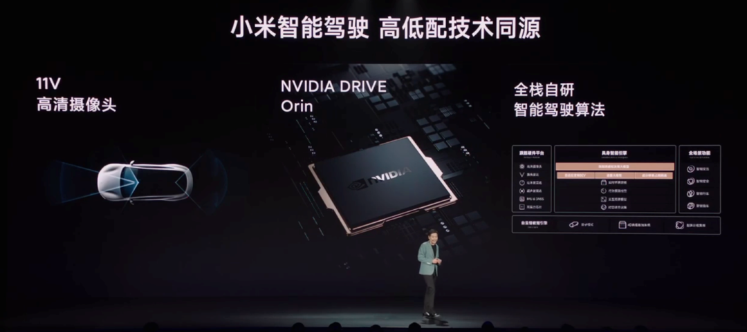 智驾硬件方面,小米汽车配备两颗英伟达Orin X智驾芯片,并配备了一颗激光雷达和11个高清摄像头,以及3个毫米波雷达和12个超声波雷达。