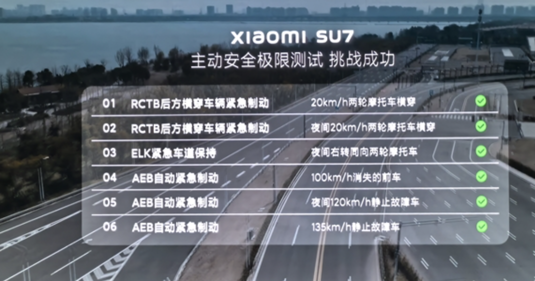 顺带一提,雷军还介绍道,此前小米SU7在主动安全功能中,AEB自动紧急制动,实测在135km/h时速下,成功识别前方车道静止故障车并刹停。而夜间120km/h静止故障车、100km/h消失的前车等挑战项目,小米SU7 AEB也成功通过挑战。
