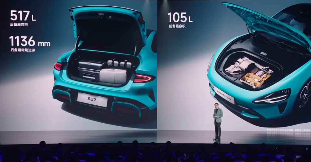 在空间方面,小米SU7前排竖向空间有1012mm,后排膝部空间105mm,后备箱空间为517L ,前备箱空间为105L。