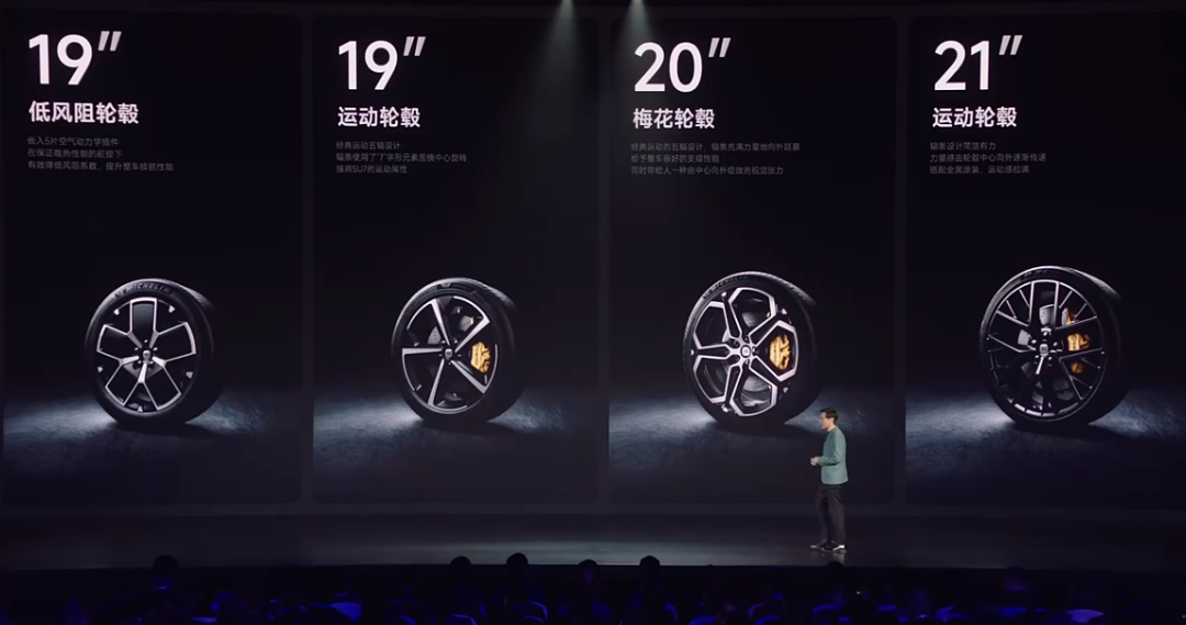 新车提供四款轮毂可选,包括19寸的低风阻轮毂和运动轮毂、造型相当别致的梅花轮毂,尺寸为20寸;而小米SU7最大的轮毂为21寸的运动轮毂。