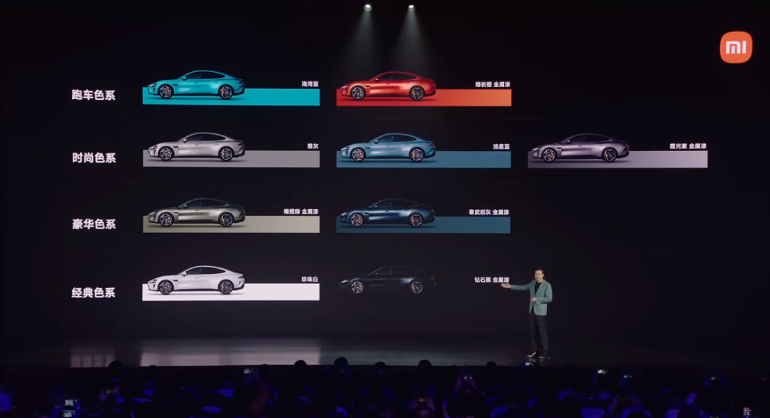 在外观方面,小米SU7的漆面来自于自然,提供跑车、时尚、豪华、经典四种色系,首发9款配色,具体如下: