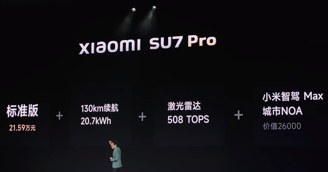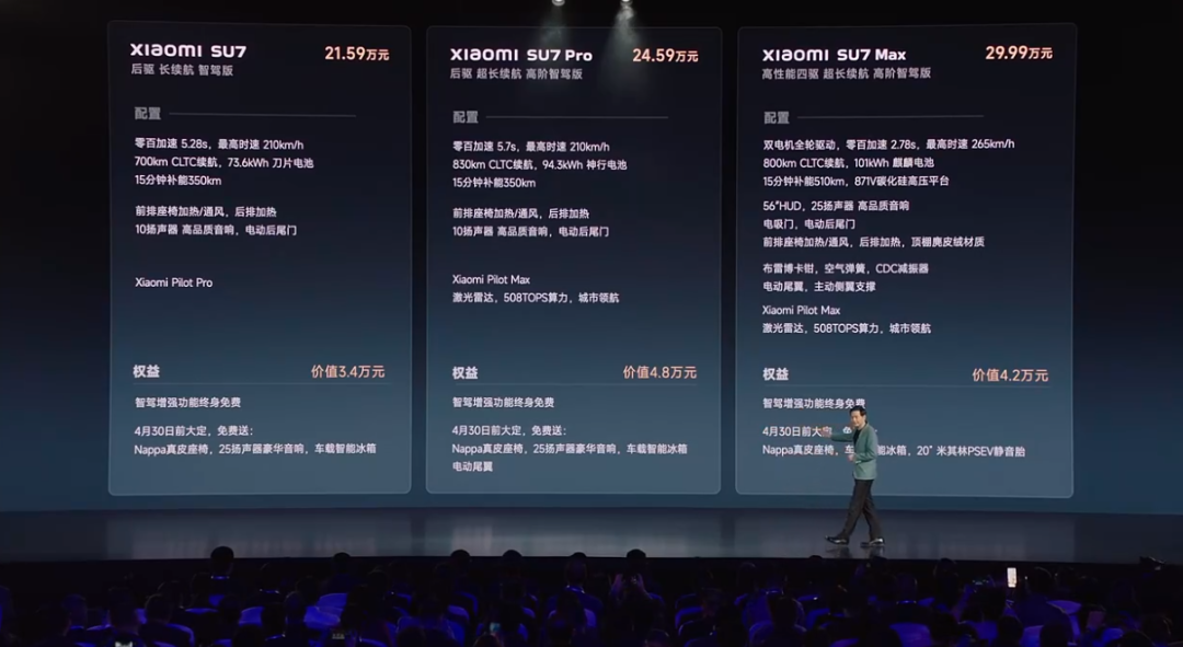 其中,小米SU7(后驱、长续航、智驾版)售价21.59万元,今晚10点正式开定,付款5000元即可锁单,4月底交付。