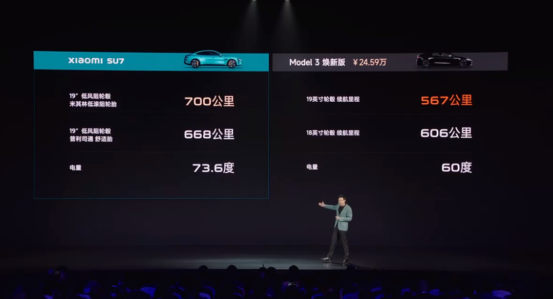 更令人惊讶的是,在使用相同的19英寸轮毂的情况下,小米SU7标准版的续航里程,甚至超过了特斯拉Model 3的长续航版本。