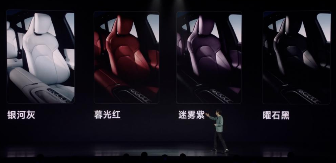 在内饰方面,小米 SU7 提供了银河灰、暮光红、曜石黑三款内饰配色,以及环绕式座舱设计。