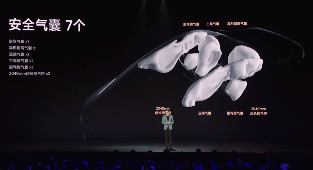 并且小米SU7还配备7个安全气囊,尤其配备了中间的远端气囊,能在侧面碰撞中,起到防止车内乘员相互碰撞的作用,这在国内车型中比较少见。