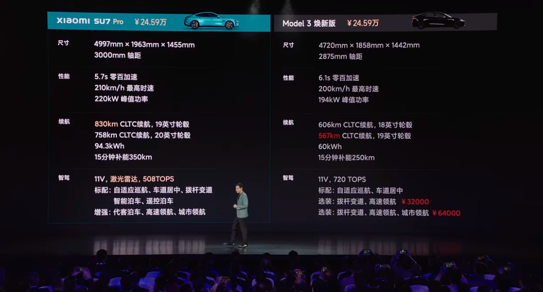 小米SU7 Pro(后驱、超长续航、高阶智驾版)售价24.59万元,与特斯拉Model 3焕新版价格相当。今晚10点正式开定,付款5000元即可锁单,5月底交付。那么问题来了,大家会选谁?