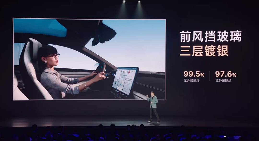据介绍,小米 SU7 在经过 38℃暴晒 1.5 小时之后,车内温度能够比特斯拉 Model 3 低 12℃。与此同时,SU7 的天幕玻璃拥有 99.9% 防紫外线率,前风挡玻璃具有 97.6% 的隔热率。