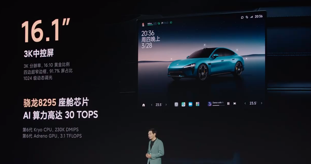 在座舱配置上,雷军介绍,小米SU7拥有更先进的交互架构,配备有16.1英寸中控生态屏,分辨率高达3K,内置澎湃 OS 车机系统 + 高通骁龙 8295 车规级芯片,中控屏下方还有拓展坞设计,可适配外接游戏手柄等设备,充分满足个性化娱乐需求。