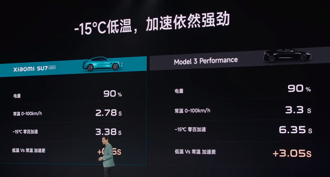 都说“低温”是电动车的最大对手,为此小米SU7进行了专项优化。在-15℃的低温下,小米SU7仍然保证3.38秒的加速性能,远超特斯拉Model 3高性能版的6.35秒,表现非常强悍。