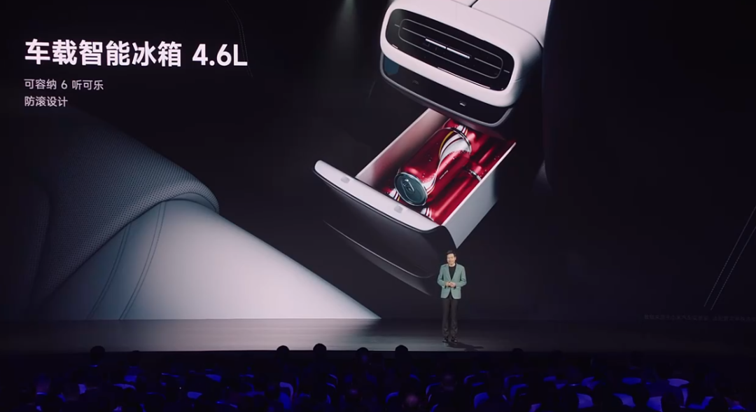 作为一款综合性能优秀的汽车,小米SU7还拥有车载冰箱,容量为4.6升。雷军表示,自己之前也曾开过带小冰箱的车,但体验并不好,里面放点东西,在转弯时里面的东西就会滚来滚去,非常影响使用体验。