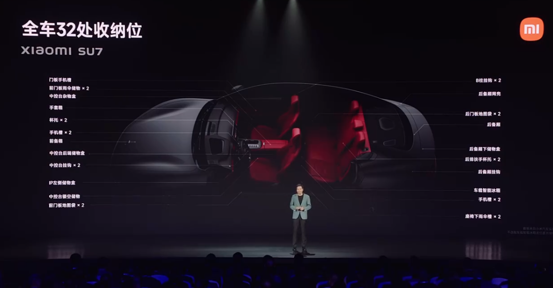 值得一提的是,小米SU7内饰还配备多项实用功能,雷军表示小米 SU7 全车拥有 32 个收纳位,除了手套箱、杯架,还为手机、雨伞、证件等都设置了专属收纳。同时声称该车自带 1/4 螺纹接口,可选装 99 元车载手机支架。