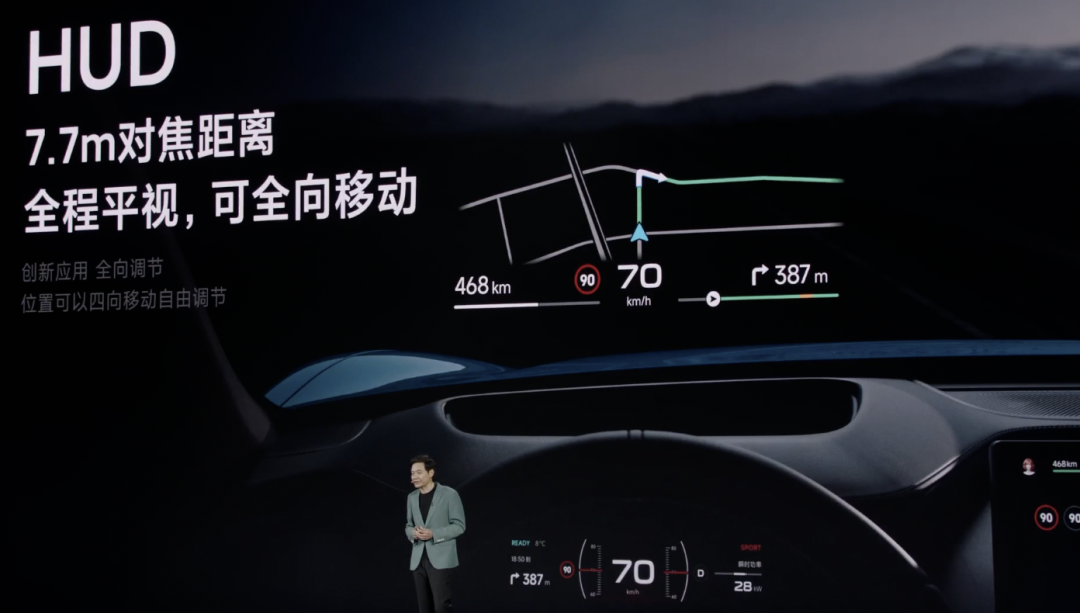 同时新车还配备了56英寸的AR-HUD抬头显示,拥有10° x 3.6°超宽视角,对焦距离为7.7米,全程平视,可全向移动,最高亮度达到13000nit,对比度1500:1,且支持亮度自适应,可根据个人习惯随时调整,在强光、逆光环境下也能清晰可见。