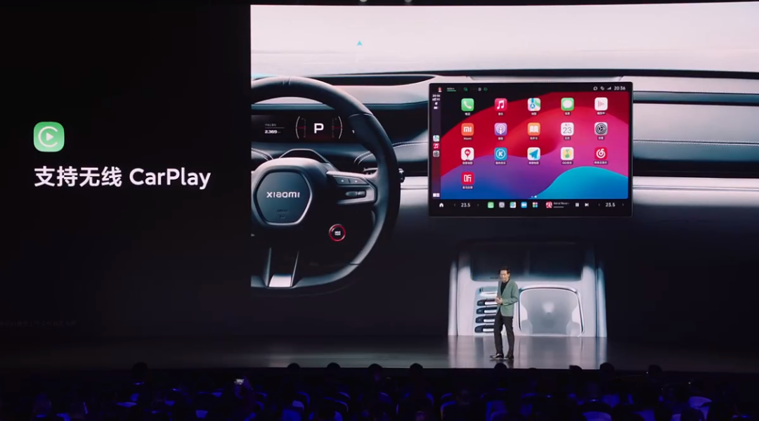 很值得称赞的是,这次小米格局相当大,还强调了苹果用户开小米汽车也有很好的体验,不仅智能座舱兼容苹果无线 AirPlay 及 Carplay,并允许使用 iPad 作为汽车后排拓展屏。