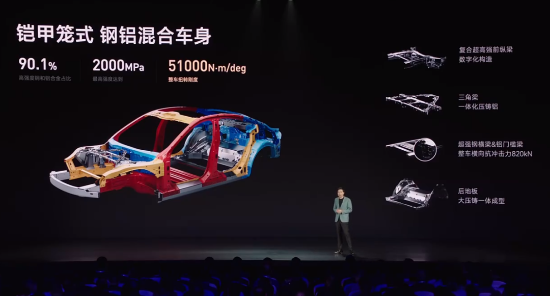 说到安全,在车身的结构上,小米SU7采用有复合超高强前纵梁、一体化压铸铝的三角梁、超强钢横梁&铝门槛梁以及大压铸一体成型的后地板等技术,整车具有抵抗820kN的横向冲击力,即使面对严苛的碰撞工况也能保持稳定。