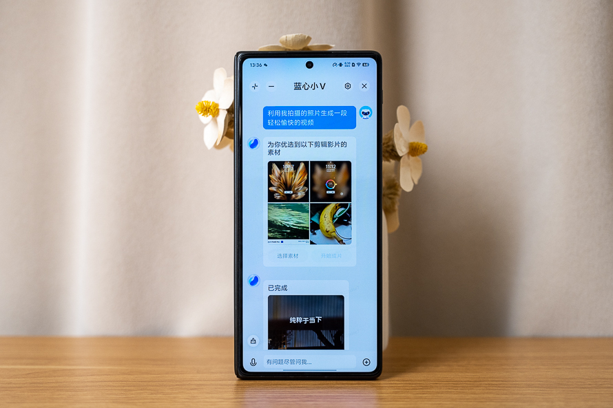 当然,AI的加持也是vivo X Fold3 Pro系统上的一大亮点,蓝心小V可以提供文字、图片等生成式服务,你也可以上传照片实现消除路人等功能,甚至还可以让蓝心小V根据你提供的素材去生成一段主题视频,而且有意思的是它生成的视频所配的文案还和素材相关,并不是胡乱瞎剪。