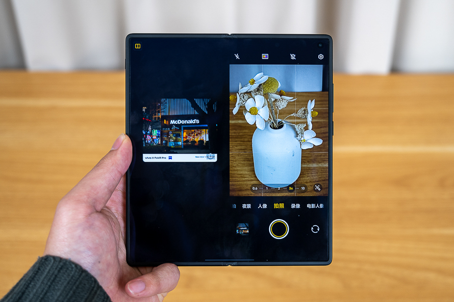所以说vivo X Fold3 Pro实际上是通过三颗镜头与五个按钮带来了12个焦段的快速切换,基本上拍照真的不用再双指拖拽画面变焦了。