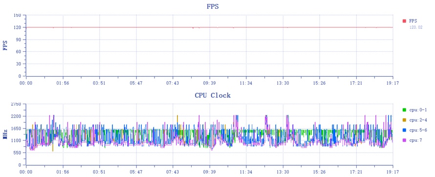 在游戏方面,这款折叠屏也是表现不俗。首先《王者荣耀》开启超高帧率与高清画质(目前还不支持超高帧率与极致画质同开),帧率曲线非常完美地稳定在120fps,几乎没有任何的波动,功耗则是3.5W,表现优异。