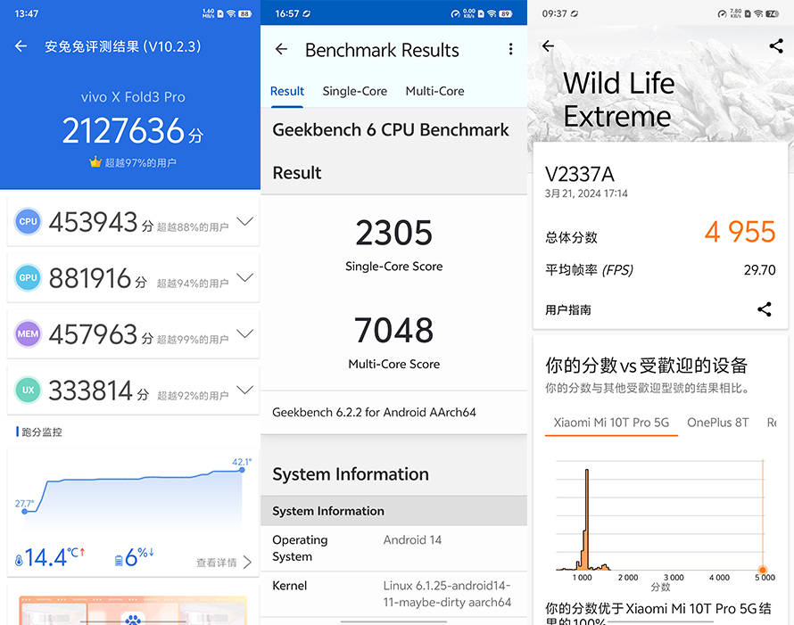 跑分方面,安兔兔跑分轻松超过210万分,达到了2127636分;Geekbench 6跑分单核2305分,多核也达到了7048分,表现很不错;3DMark测试Wild Life Extreme得分4955分。