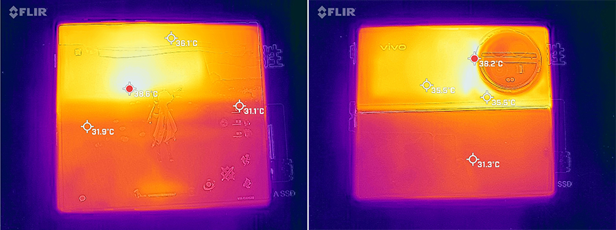 并且由于屏幕展开的原因,在玩游戏时我们只要握着外屏的部分,而手机发热部分主要集中在另外一半的摄像头部分,因此玩游戏时并不会感觉到什么发热,最终测试下来手机的最高温度在38.6℃左右,不过握持区域的温度也就32℃上下。