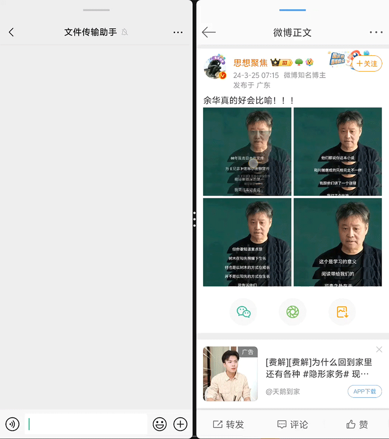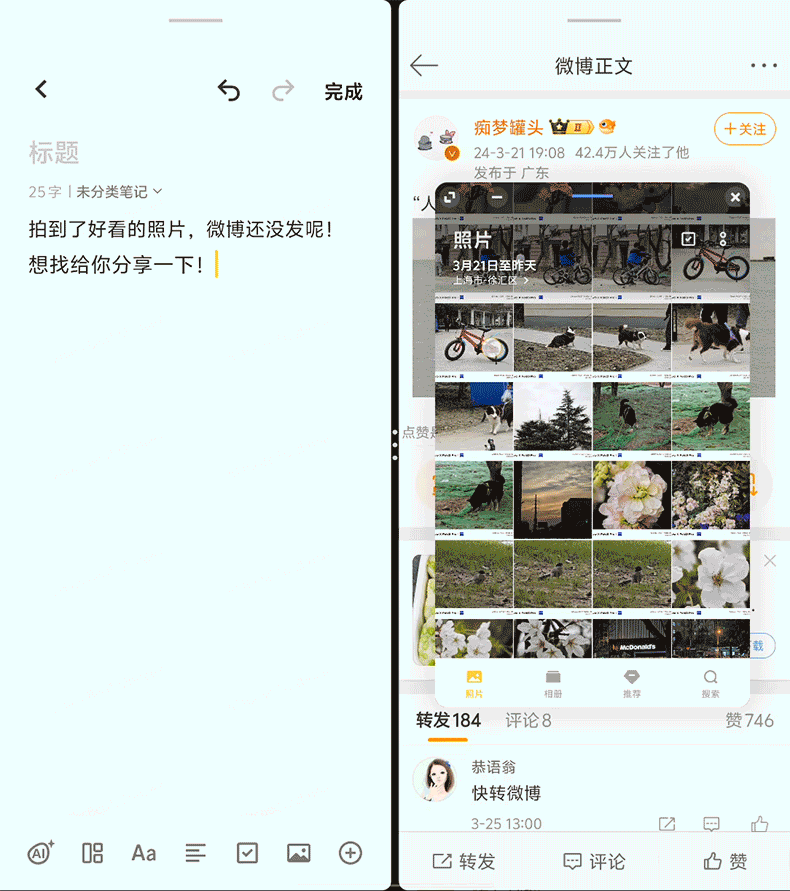 不过vivo X Fold3 Pro做的非常好的是打通了一些主流App,能够在分配或者开启小窗时,直接拖拽图文内容进行分享。比如我分屏使用微信与微博,在微博上看到了好看的照片,直接拖拽到微信上就可以发送出去,不需要再保存或者点击分享分好几个步骤才能做到,极大地提升了效率。