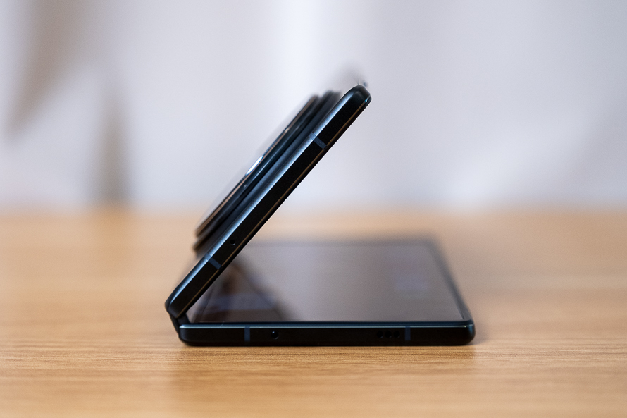 手机采用了碳纤维超耐久轻量铰链,手机折叠状态下屏幕能够严丝合缝,并且也可以做到60°至120°的自由悬停,如果将屏幕展开之后看折痕的话,自然多少是能够看到有一些的,不过折痕的深度与宽度都已经控制地非常好,并不会影响日常的操控体验。