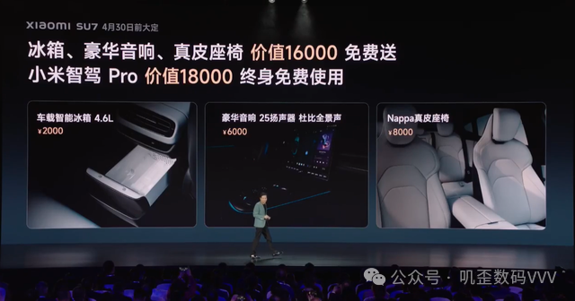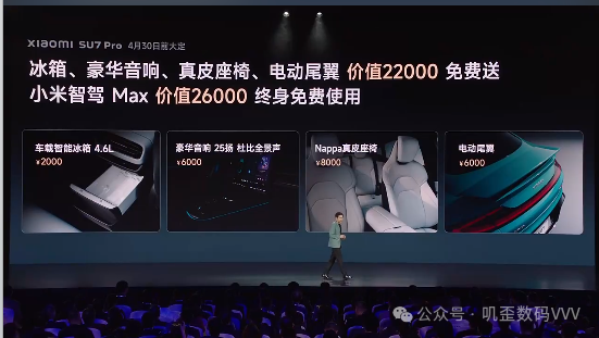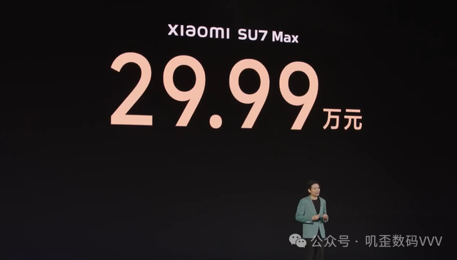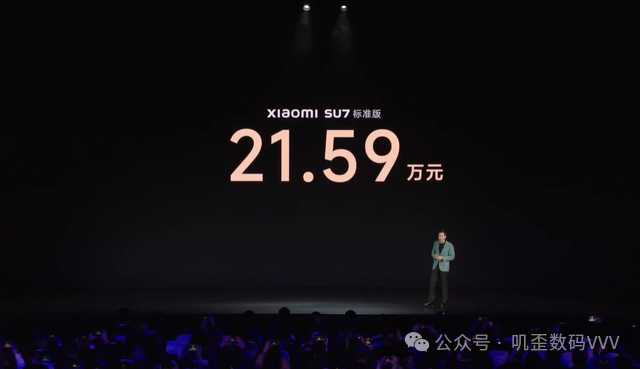 最后是大家最关注的价格了,小米SU7的起步价为21.59万元。冰箱彩电大沙发,4月30日前定直接送!标准版21.59万,一下少了1.6,起步价也就是19.99万了。小米SU7 Pro定价24.59万元,大定直接送2.2万元的权益。小米SU7Max的价格是29.99万元,送4.2万的权益。