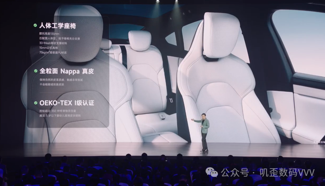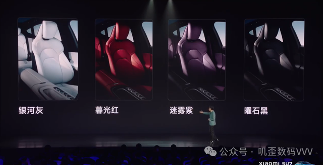 小米SU7提供了9种配色可以选择,其中5款是金属漆,分别是橄榄绿、海湾蓝、雅灰、流星蓝、霞光紫、熔岩橙、珍珠白、钻石黑。同时还支持了4款内饰可以选择,分别是银河灰、暮光红、迷雾紫、曜石黑。座椅采用了人体工学设计,nappa真皮,通过了OEKO-TEX I级认证。