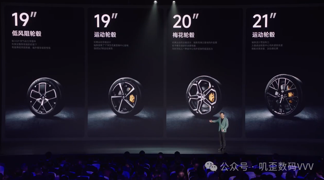 小米SU7在轮毂方面提供了19寸低风阻轮毂、19英寸运动轮毂、20寸梅花轮毂、以及21寸运动轮毂四个版本可以选择。