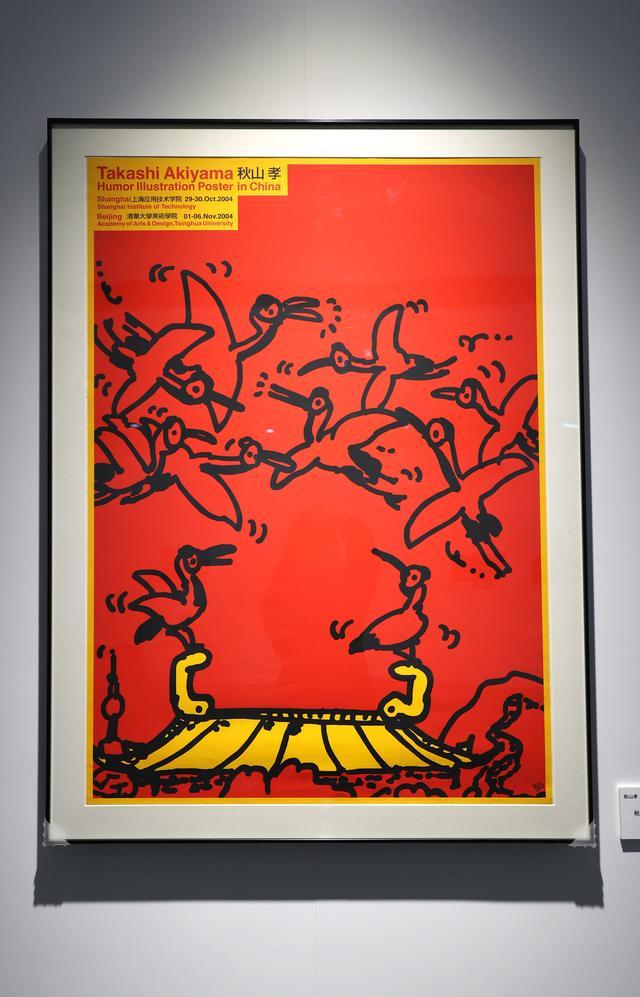 一张红、黄、黑三色组成的海报,是国际上最为活跃的插画海报艺术家之一秋山孝的作品。只见在红色的天空中,金黄色的屋顶上,仙鹤正在飞舞,更代表了吉祥之意。这种吉祥的表现场景,是为了庆祝清华大学美术学院成立48周年和上海应用技术学院的艺术设计大楼落成而举办的秋山孝海报展。这件作品灵感来源于宋徽宗的《瑞鹤图》,2003年秋山孝应邀来到上海,看到正在上海博物馆展出的这件原作,而后创作了这幅海报。秋山孝在设计方面有着独特视觉语言,动感色彩和线条充满着视觉冲击力,加上幽默具有生命力的表达形式,多年来对大众产生不同的启发和借鉴意义。