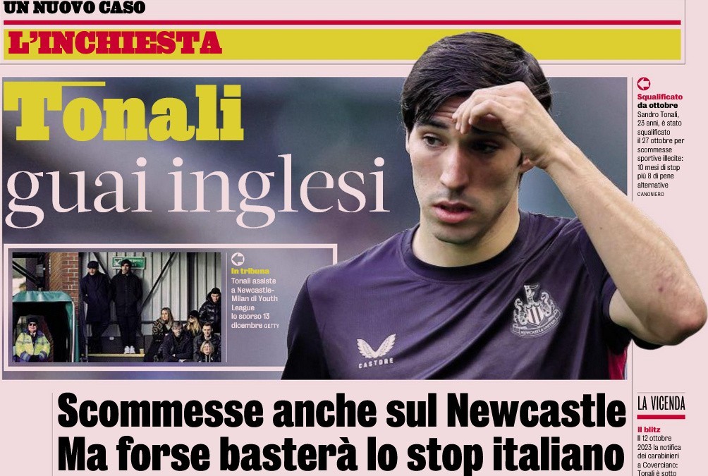 此前英足总已经宣布对托纳利转会纽卡斯尔联之后的50次违规赌球问题提起了指控,对此《米兰体育报》驻伦敦记者达维德-基内拉托进行了跟踪报道。