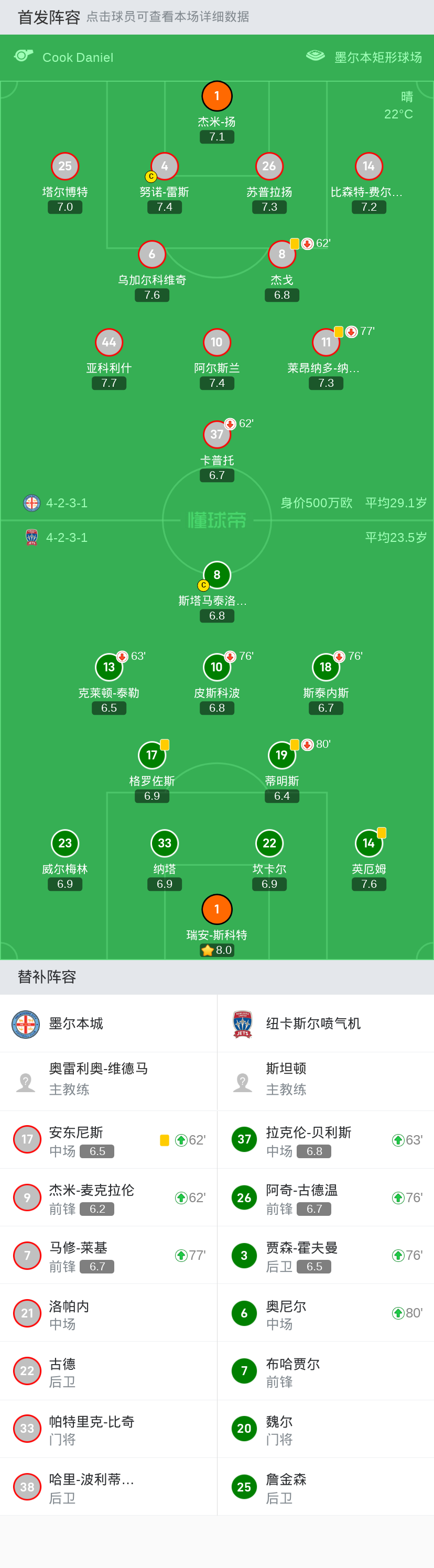 墨尔本城首发:26-苏普拉扬, 1-杰米-扬, 10-阿尔斯兰, 4-努诺-雷斯, 8-杰戈, 44-亚科利什, 6-乌加尔科维奇, 11-莱昂纳多-纳特尔, 14-比森特-费尔南德斯, 25-塔尔博特, 37-卡普托